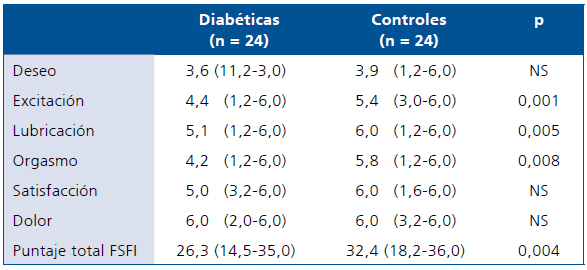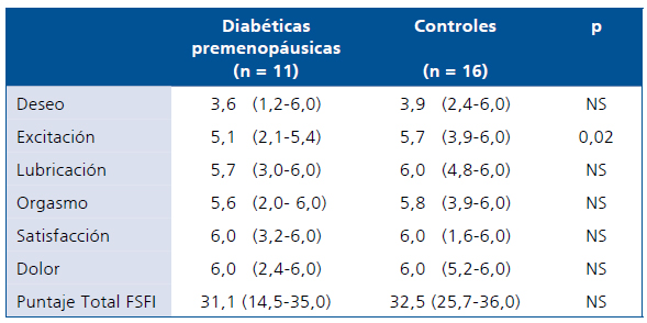 En las diabéticas premenopáusicas las funciones sexuales con los puntajes más bajos, fueron deseo, excitación, lubricación y orgasmo (Tabla 3). Sin embargo, al compararlas con sus controles, sólo en la excitación se encontró significancia estadística (p = 0,02). El puntaje total FSFI para las mujeres premenopáusicas y controles fue similar, 31,5 y 32,5 respectivamente (NS).
