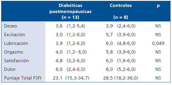 Al aplicar el FSFI en mujeres postmenopáusicas (Tabla 4) se puede apreciar que en todos los dominios el puntaje de las diabéticas es inferior a los controles, excepto en el dolor, alcanzando significancia estadística sólo en la lubricación (p = 0,049). Se destaca que el puntaje total del FSFI mostró cifras menores en las diabéticas (23,1) que en los controles (28,5) (p = 0,05).