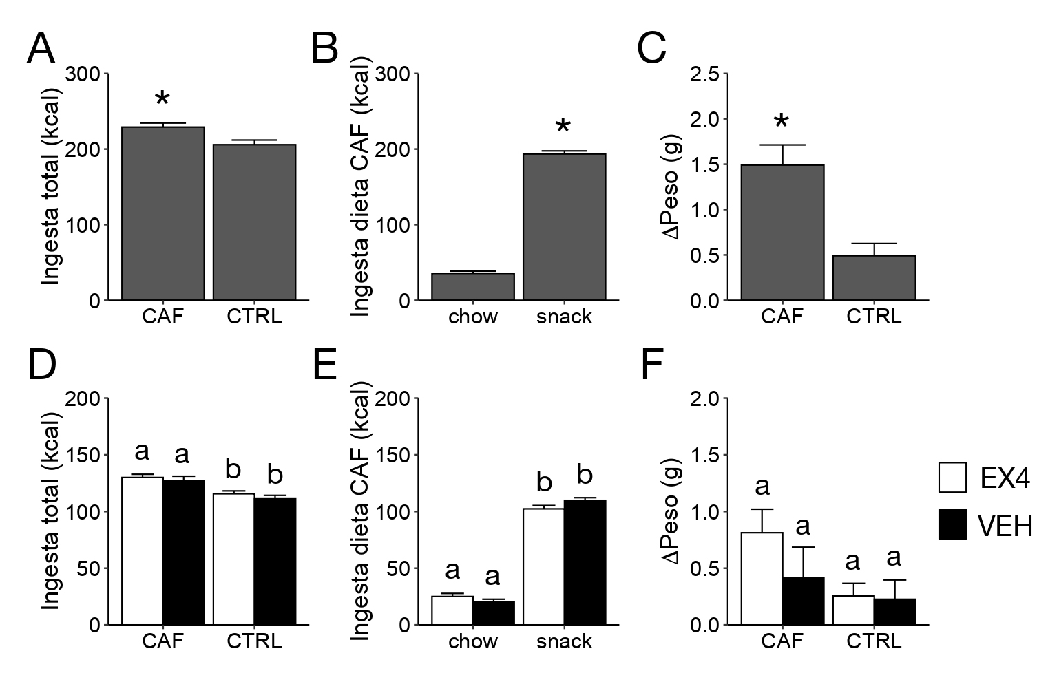 Durante la etapa de alimentación sin inyecciones, los ratones alimentados con dieta CAF acumularon una ingesta de calorías totales significativamente mayor que los ratones del grupo CTRL (p < 0,05; Figura 1A), lo que estuvo asociado a un mayor consumo de snacks comparado con chow en ratones alimentados con dieta CAF (Figura 1B). Los efectos observados en ingesta reflejan los cambios en peso corporal. Durante la etapa de alimentación sin inyecciones, los ratones alimentados con dieta CAF aumentaron significativamente su peso corporal en comparación a los ratones alimentados con dieta CTRL (p < 0,05; Figura 1C). Comparado con la administración de vehículo, la administración de EX4 no tuvo un efecto significativo sobre la ingesta total de calorías (Figura 1D), no afecto el consumo de snacks o chow (Figura 1E) o el peso corporal (Figura 1F) independiente si los ratones fueron alimentados con dieta CAF o control.