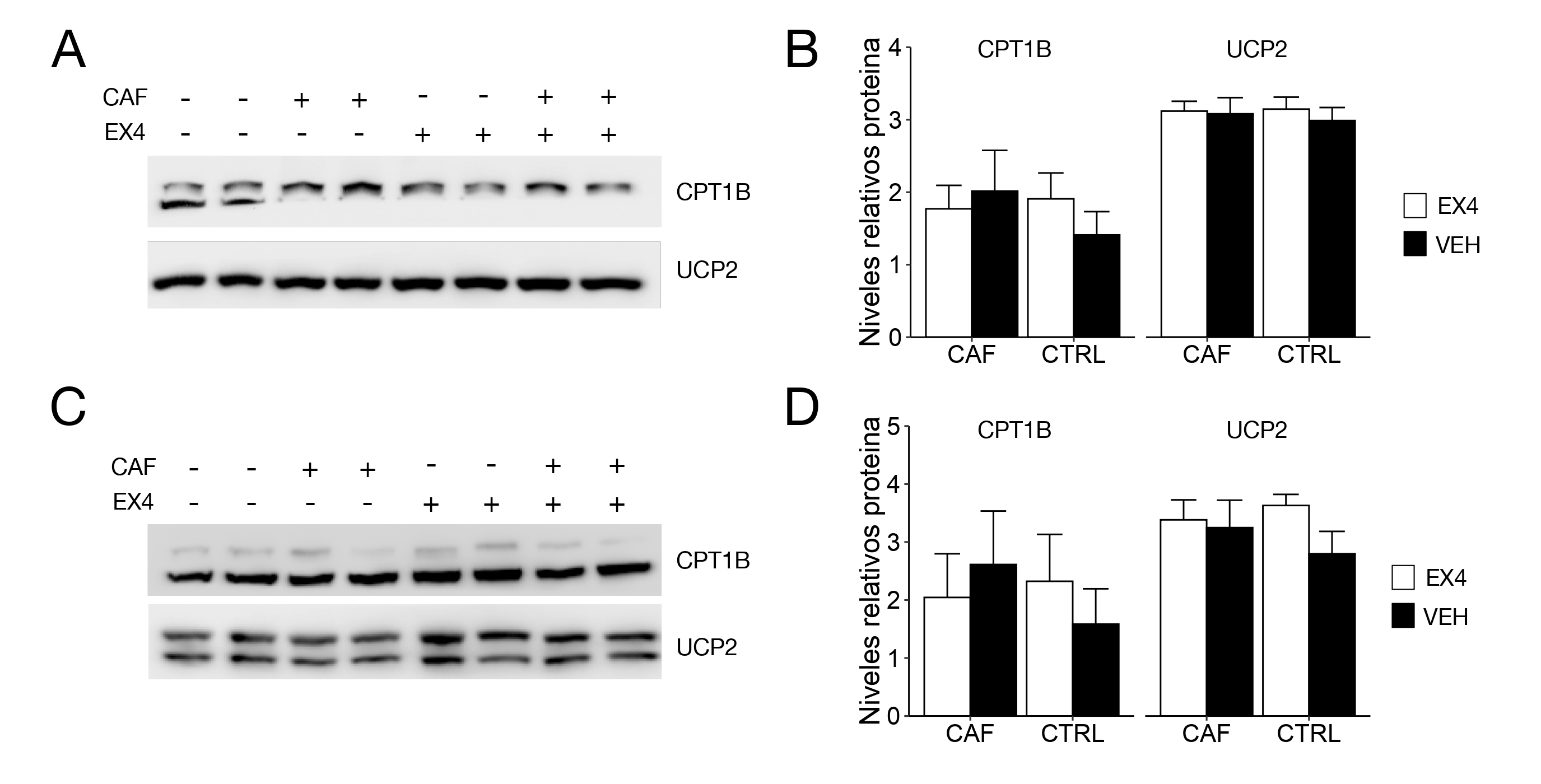 No hubo efectos de dieta o tratamiento con EX4 en la expresión de las proteínas CPT1 y UCP2 (Figuras 2A y 2B) del músculo soleo. Tampoco se observaron efectos de la alimentación con dieta CAF o la administración de EX4 en estas proteínas en el músculo gastronemio (Figuras 2C y 2D).