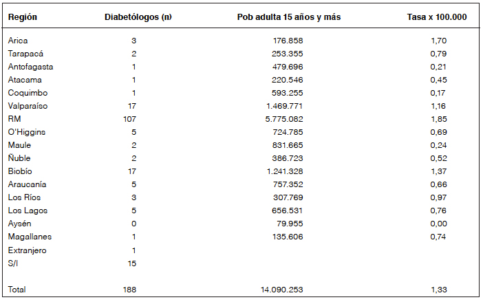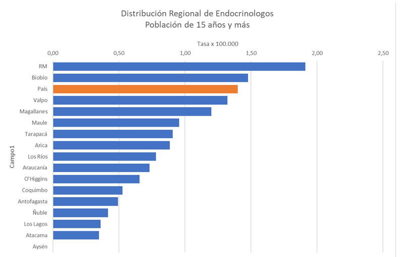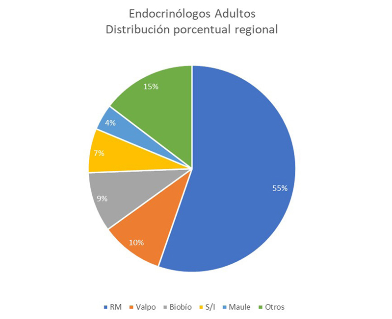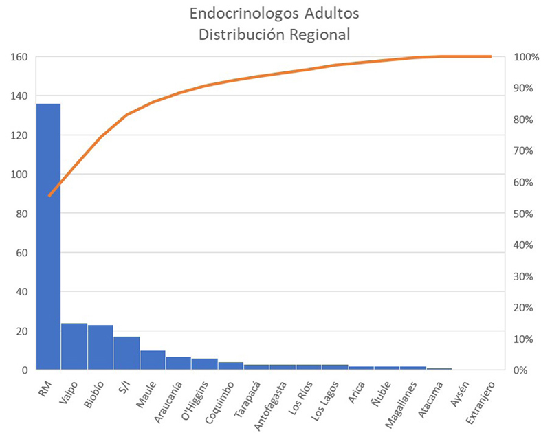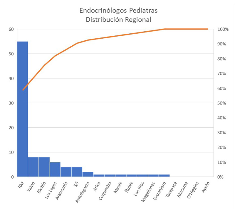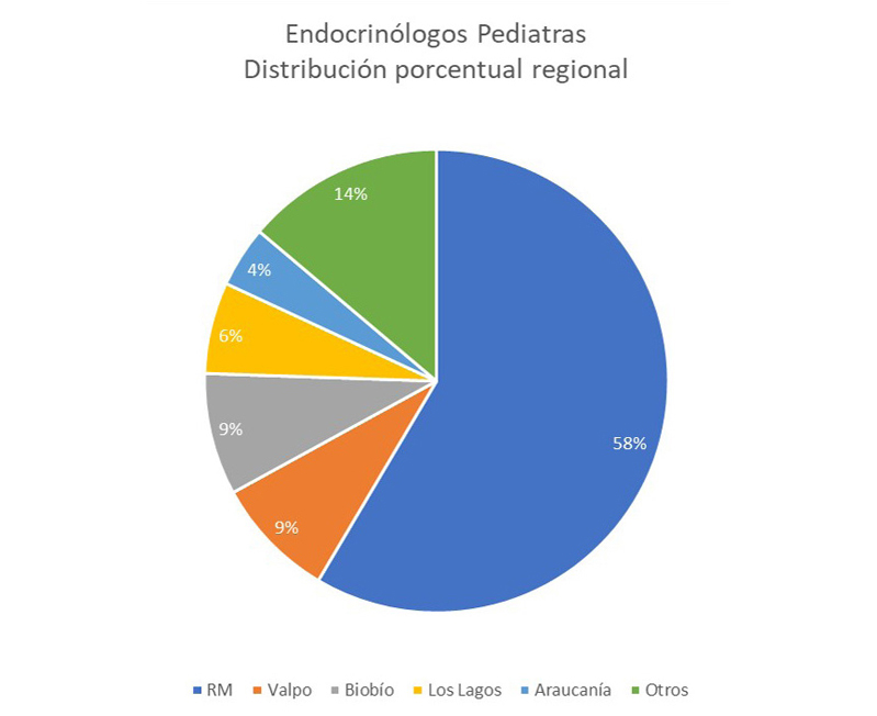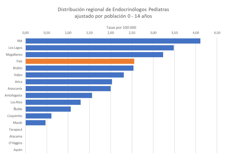 Este estudio da cuenta de la desigual distribución de los profesionales de endocrinología y diabetes de nuestro país, en el cual tres regiones concentran el 75 % de los especialistas, considerando que las regiones Metropolitana, Valparaíso y Bio Bío agrupan el 59.6% del total de población nacional. Esta tendencia a la concentración de especialistas en grandes centros urbanos se repite al ajustar los datos por población, con tasas por sobre la nacional en las tres regiones mencionadas. Las excepciones las constituyen la región de Arica y Parinacota para diabetología -donde están inscritos 3 profesionales- y la de Los Lagos, donde se cuentan 6 endocrinólogos infantiles.