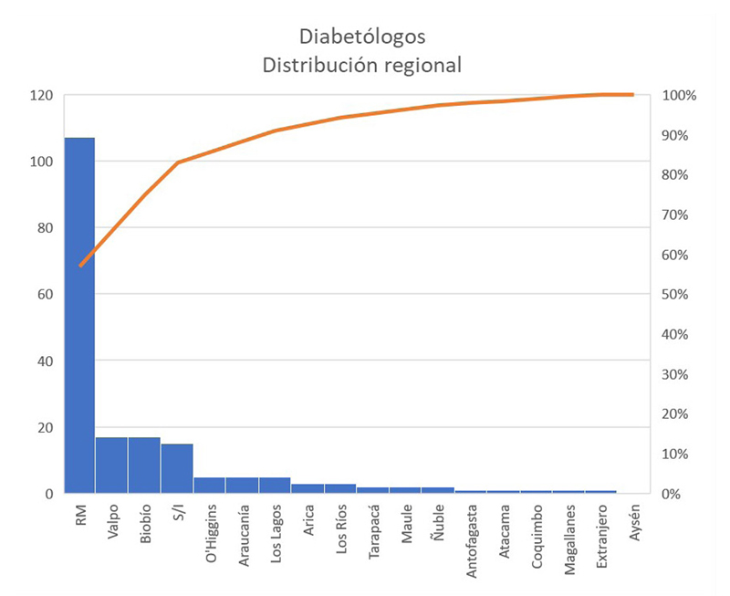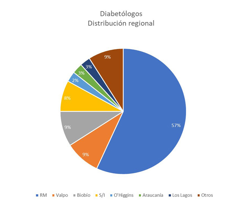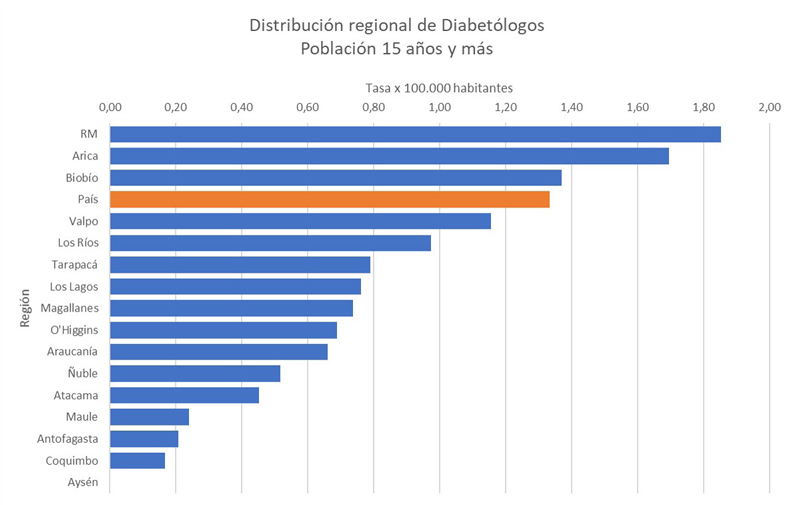 Es destacable el hecho de que en al menos 5 regiones del país se registre sólo un especialista para toda la región; más seria aun es la situación de la región de Aysén, donde no se registran profesionales de endocrinología ni diabetología.