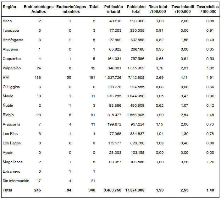 Del total de endocrinólogos del país, 21 de 340 no tienen registro de la región donde ejercen -17 internistas, 4 pediatras-, que fueron excluidos del análisis poblacional.