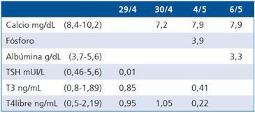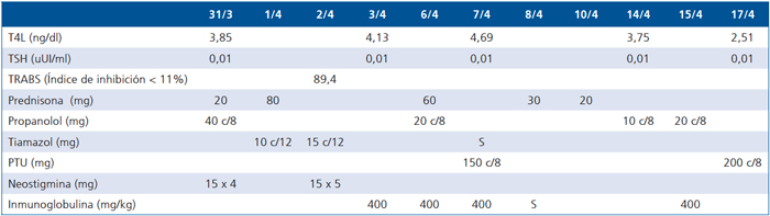 Evaluada por oftalmología se describe oftalmopatía tiroidea GIII con actividad moderada, agudeza visual OD: 20/25, OI: 20/30, exoftalmometría: OD: 22, OI: 25, sin aumento de la tensión ocular. Se indica Prednisona 1,5 mg/kg por 7 días y TAC de órbita muestra signos de oftalmopatía tiroidea sin otras complicaciones. Paralelamente evaluada por neurología, aporta una historia de 3 meses de mayor fatigabilidad y dificultad en deglución. Al examen se encuentra diplopía, imposibilidad de mantener cuello en decúbito, Mingazzini < 20", realiza sólo una sentadilla. Se considera que cursa con Miastenia Gravis descompensada, y se aumenta Neostigmina a 15 mg cinco veces al día. En relación a patología endocrinológica (Tabla 1) se reinicia Tiamazol 10 mg cada 12 horas y se aumenta Propanolol a 40 mg cada 8 horas.